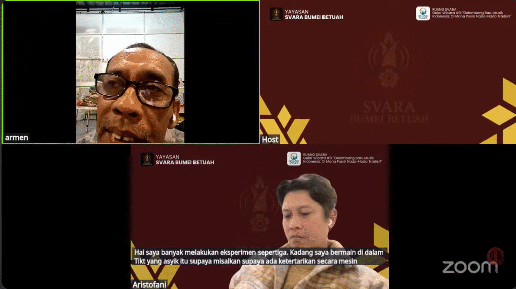 Diskusi ini menghadirkan dua narasumber berpengalaman: Armen Suwandi (Om Armen), Ketua Citra Art Studio dan musisi tradisi senior, serta Aristofani Fahmi (Bang Ito) dari Konstelasi Artistik Indonesia yang juga terlibat langsung dalam tim kerja KMI.