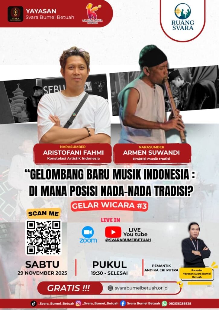 Bengkulu (Daring) – Yayasan Suara Bumi Betuah kembali menggelar diskusi hangat dalam “Gelar Wicara Ruang Suara Episode Ketiga”. Diskusi ini menyoroti hasil Konferensi Musik Indonesia (KMI) yang baru saja usai, dengan fokus utama: Di mana posisi musik tradisi di tengah arus industri musik modern dan global?